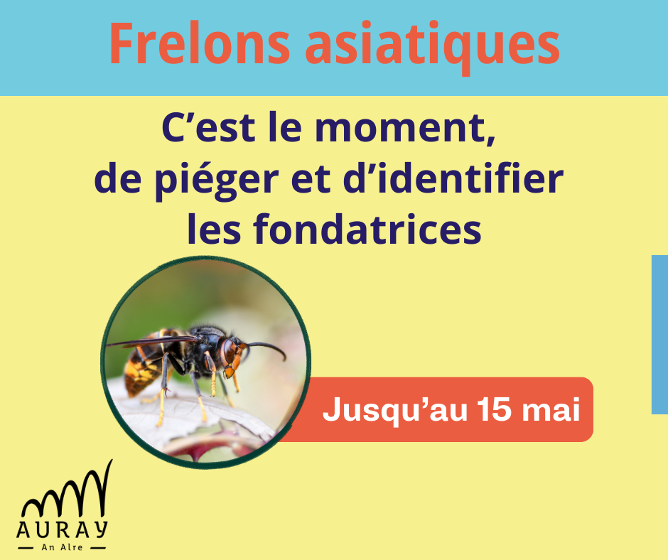 🔎 Il est repérable à ses pattes de couleur jaune et sa large bande orangée à l’extrémité de son abdomen. 🐝Menace pour les abeilles, le frelon asiatique constitue un danger potentiel pour l’homme. 🗓️Afin de freiner sa multiplication, une campagne de piégeage est encouragée jusqu’au 15 mai. C’est le moment de capturer les fondatrices. Ce sont elles qui construisent les nids. ➡️Créer le piège, identifier et comptabiliser les spécimens, pour tout savoir consulter https://www.auray.fr/ma-vie-pratique/proprete/nuisibles