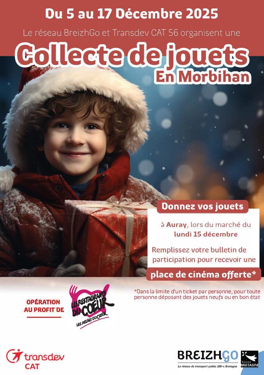 La collecte annuelle de jouets organisĂ©e par le service de transport BreizhGo revient cette annĂ©e du 5 au 17 dĂ©cembre 2025, en faveur des Restos du CĆur.