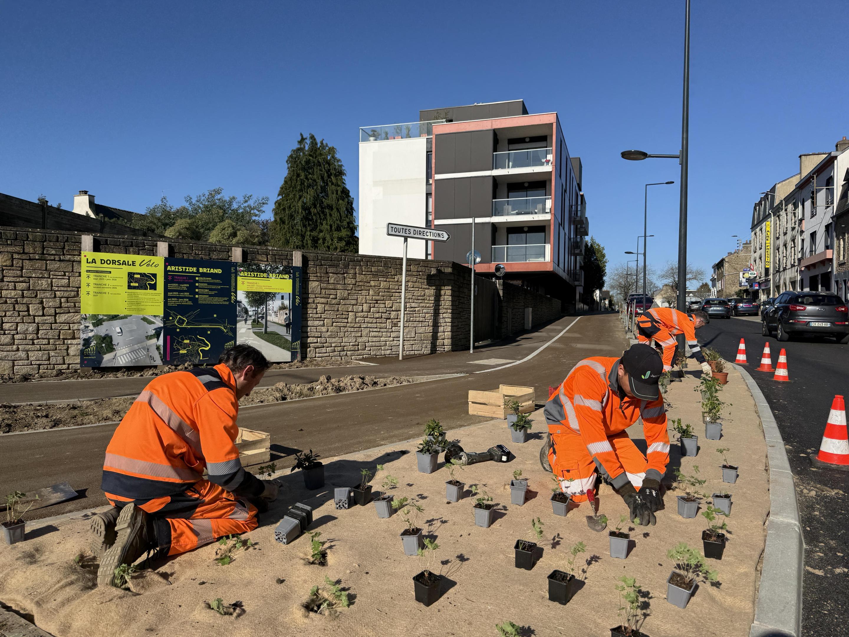 Le 9 mars, la plantation d’un premier arbre, un noisetier de Byzance, préfigurait la présence à venir de quatre autres spécimens : un prunus, un chêne sessile, un charme et un érable champêtre. Ils ont été choisis, à la fois pour leur port ornemental et leur résistance aux aléas climatiques. Plantées en bordure de la piste cyclable, les vivaces telles que les agapanthes et les gaura répondent à la fois à des impératifs de sécurité du lieu où les usages sont multiples (vélo, piéton, voiture), d’entretien a minima et également de résistance aux aléas climatiques. La signalétique verticale et horizontale et le mobilier urbain (barrières et potelets, bancs et abribus) complètent l’aménagement de cette première tranche.
