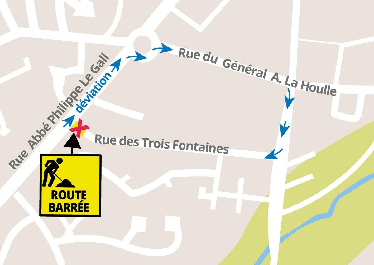 À compter du lundi 20 octobre 2025, et pour une durée de 5 jours, l’accès à la rue des 3 Fontaines par la rue Abbé Philippe Le Gall sera barré en raison de travaux.