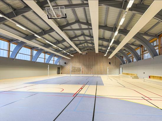La seconde phase, achevée en janvier 2026, a consisté à rénover l’ancien gymnase tout en conservant sa charpente d’origine. Cet espace conserve son usage initial. Près de 900m² permettent la pratique multi-sports : handball, volleyball, basket, badminton, futsal, escrime...