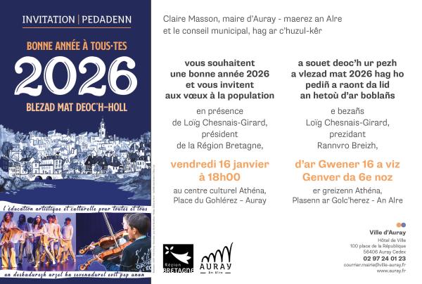 Claire Masson, Maire d’Auray et le Conseil municipal vous souhaitent une bonne année 2026 et vous invitent aux vœux à la population, en présence de Loïg Chesnais-Girard, Président de la Région Bretagne.